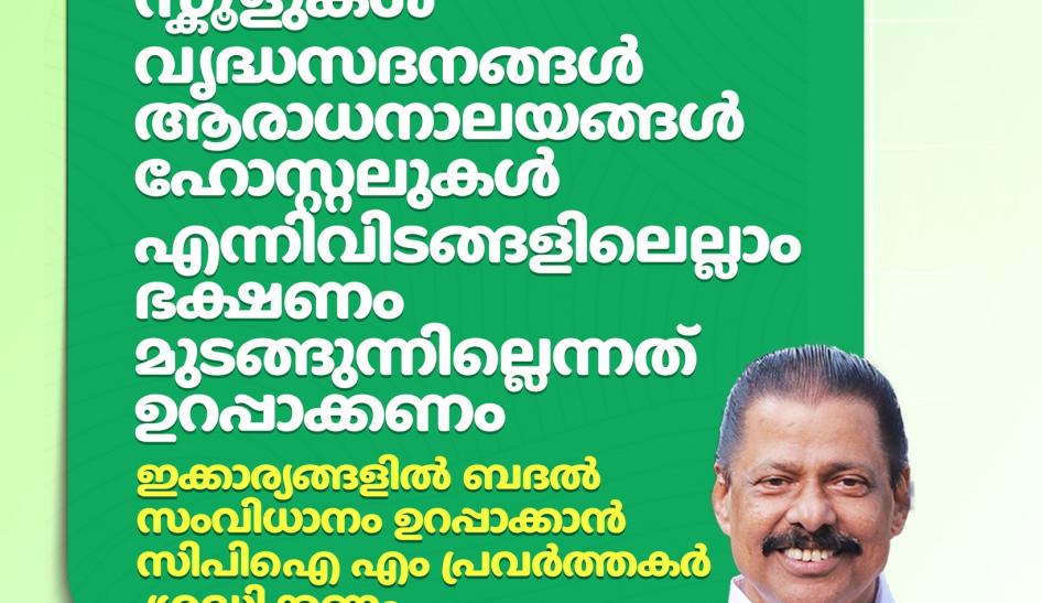 പാചകവാതക ക്ഷാമം: ആശുപതികൾ, സ്കൂളുകൾ, വൃദ്ധസദനങ്ങൾ, ആരാധനാലയങ്ങൾ, ഹോസ്റ്റലുകൾ എന്നിവിടങ്ങളിലെല്ലാം ഭക്ഷണം മുടങ്ങുന്നില്ലെന്നത് ഉറപ്പാക്കണം. ഇക്കാര്യങ്ങളിൽ ബദൽ സംവിധാനം ഉറപ്പാക്കാൻ സിപിഐ എം പ്രവർത്തകർ ശ്രദ്ധിക്കണം.