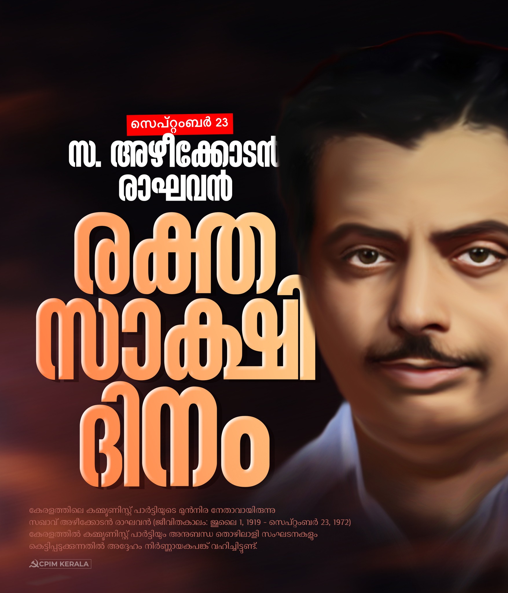 കേരളത്തിലെ കമ്യൂണിസ്റ്റ് പ്രസ്ഥാനത്തിന്റെ സമുന്നത നേതാവായിരുന്ന സ. അഴീക്കോടന് രാഘവന്റെ രക്തസാക്ഷിത്വ വാര്ഷികദിനമാണ് ഇന്ന്. ഏവര്ക്കും പ്രിയപ്പെട്ട അഴീക്കോടന് സഖാവിന്റെ ജീവന് പൊലിഞ്ഞിട്ട് 53 വര്ഷം പിന്നിടുകയാണ്. 1972 സെപ്തംബര് 23ന് രാത്രിയായിരുന്നു ആ അരുംകൊല. കൊല്ലപ്പെട്ട സമയത്ത് സിപിഐ എം സംസ്ഥാന സെക്രട്ടറിയറ്റ് അംഗവും ഐക്യമുന്നണിയുടെ കണ്വീനറുമായിരുന്നു അഴീക്കോടന് രാഘവന്. പാര്ടി പരിപാടിയില് പങ്കെടുക്കാനായി സഖാവ് തൃശൂരില് എത്തുന്നുണ്ടെന്ന് മുന്കൂട്ടി മനസ്സിലാക്കിയ രാഷ്ട്രീയശത്രുക്കള് ആസൂത്രണം ചെയ്തതായിരുന്നു കൊലപാതകം. വലതുപക്ഷ ശക്തികള് ഇടതുപക്ഷ അരാജകവാദികളുമായി ചേര്ന്ന് നടത്തിയ ആസൂത്രണമായിരുന്നു അരുംകൊലയ്ക്ക് ഇടയാക്കിയത്. കോണ്ഗ്രസ് നേതൃത്വത്തിന്റെ എല്ലാവിധ പിന്തുണയും അതിന് ഉണ്ടായിരുന്നു.