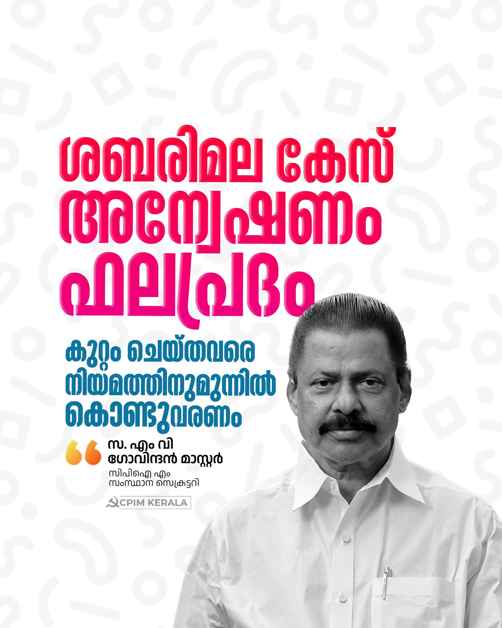 ശബരിമലയിലെ സ്വർണമോഷണക്കേസുമായി ബന്ധപ്പെട്ട പൊലീസ് അന്വേഷണം ഫലപ്രദമാണ്. അന്വേഷണത്തെ പൂർണമായി പിന്തുണയ്ക്കുന്നു. കുറ്റം ചെയ്തവർ ആരായാലും നിയമത്തിനുമുന്നിൽ കൊണ്ടുവരണം. ശബരിമലയിലെ ഒരുതരി സ്വർണംപോലും നഷ്ടപ്പെടില്ല എന്ന ഉറപ്പാക്കാനുള്ള നടപടിവേണം എന്നാണ് പാർടി ആദ്യംമുതൽക്കേ വ്യക്തമാക്കിയത്.